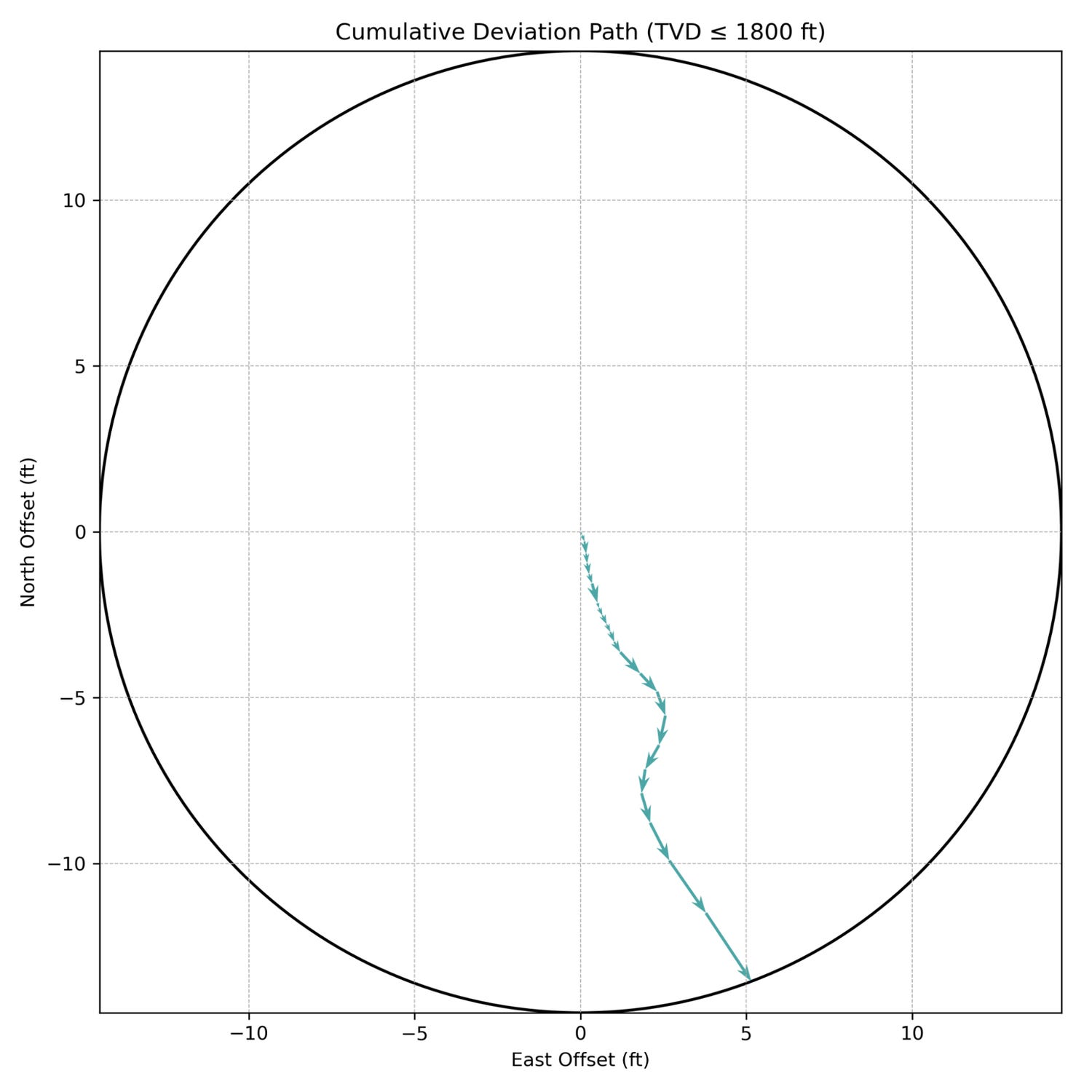 So we did something rarely done in geothermal: we actively steered the well even while drilling straight down, using mud motors and directional drilling assemblies designed to keep the bit perfectly vertical without sacrificing speed. Our vertical section stayed within ~1 degree of deviation from vertical over the first 1,800 feet—well within tolerances for optimal line shaft pump performance (Figure 2), while being one of the fastest sections of our well drilled (Figure 1).
