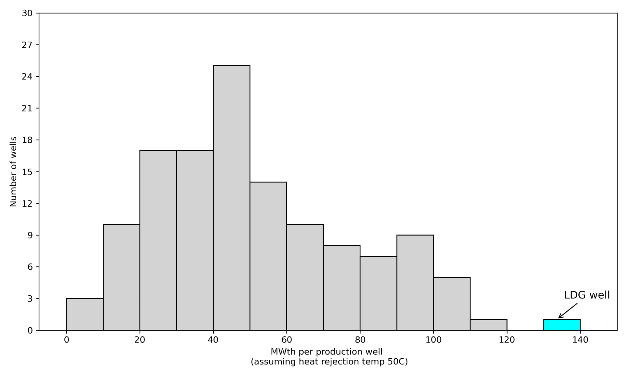 Our 14-inch line-shaft pump is now installed and running, and our new well is now piped into our power plant, and it has already ~tripled our plants output, alone. With this operating data, we can now compare our new wells production to production data across 18 operating geothermal well fields in Nevada (nearly all such well fields utilize pumps for production). Assuming a brine outlet temperature of 50 C (note that every plant has a slightly different brine outlet temp, depending on plant and brine conditions), we can model how many MWth are delivered to and utilized by these Nevada geothermal power plants, and compare them to our new well. This simple comparison shows just how exceptional our new LDG production well really is; providing more MWth than any operating well in Nevada (Figure 5). For pumped geothermal wells, it is the most productive geothermal well in the USA today.